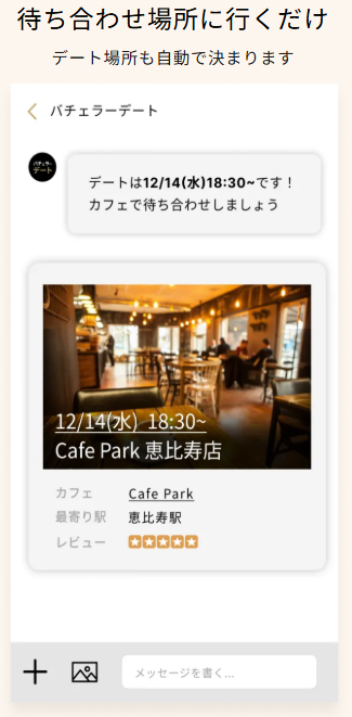 従来のマッチングアプリは、相手を検索して「いいね」を送ったり、何往復もメッセージをしないとデートにつながりません。